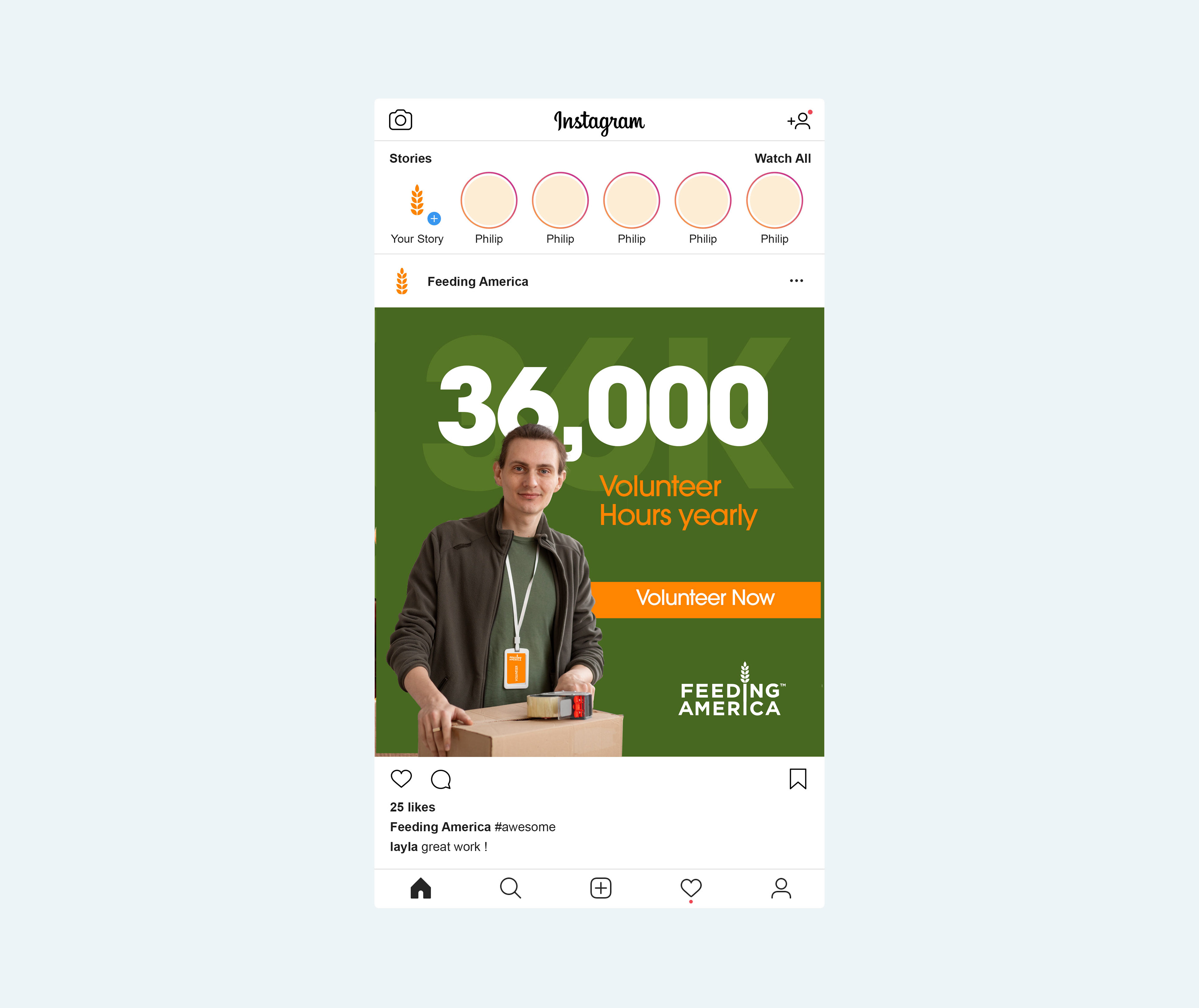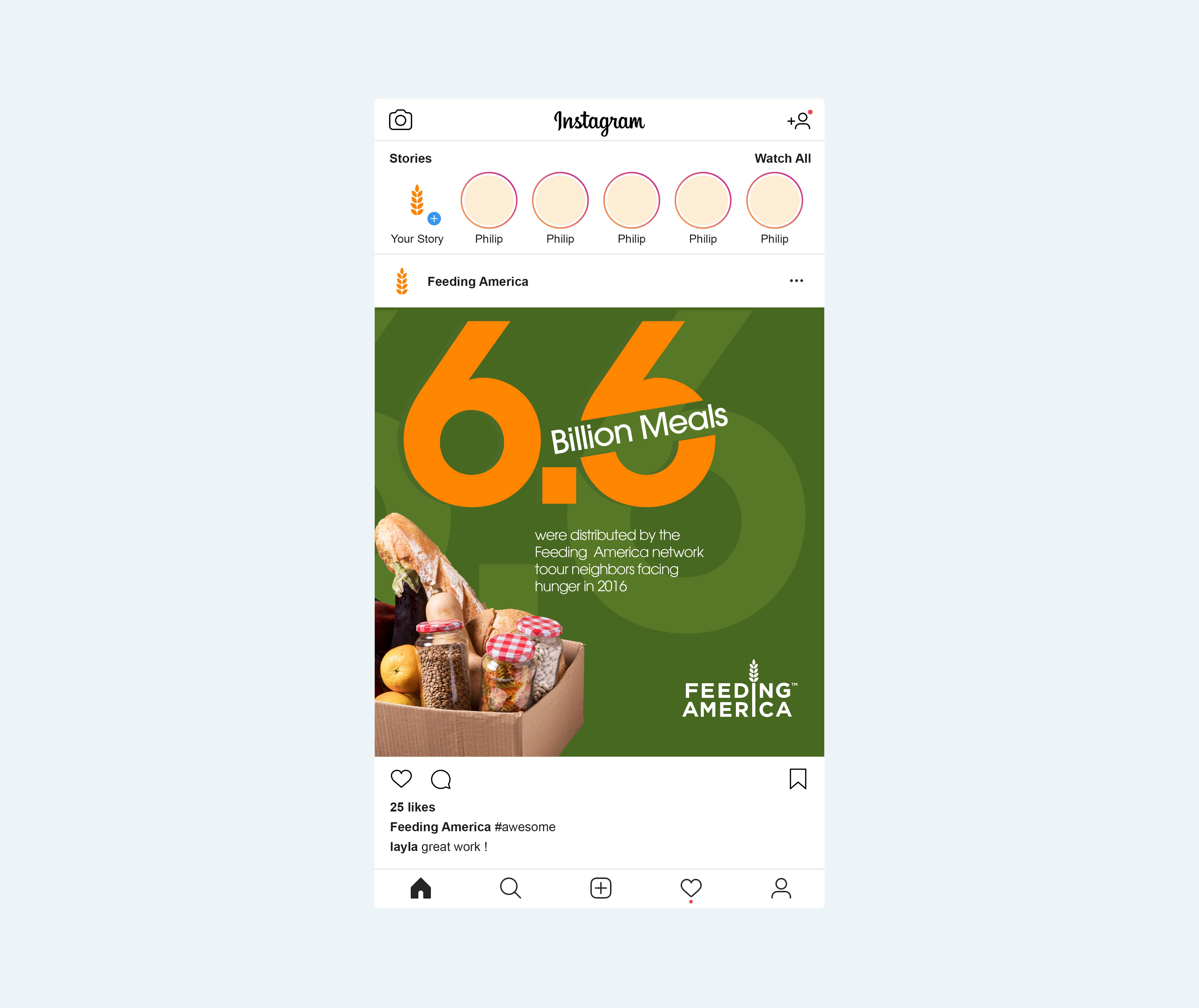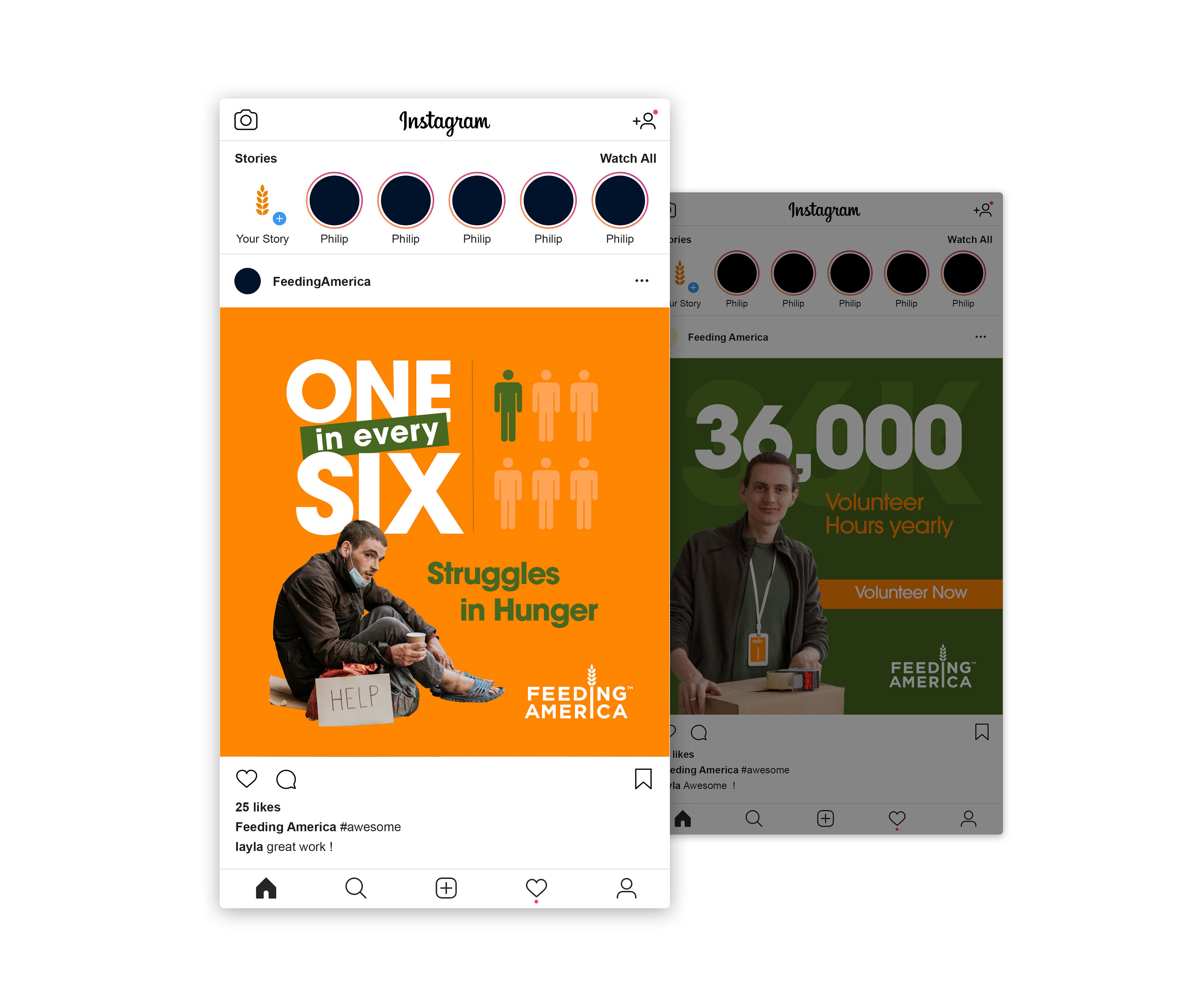 Designing for impact — this Instagram campaign highlights food insecurity in America, where 1 in 6 people face hunger. Visual storytelling that informs, inspires, and drives change for Feeding America